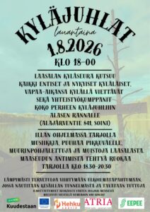 Koko perheen kyläjuhlat järjestetään lauantaina 1.8.2026 klo 18 alkaen Laasalassa, Alasen rannalla. Kyläjuhliin ovat lämpimästi tervetulleita nykyiset ja entiset kyläläiset, kylällä vapaa-aikansa viettävät sekä yhteistyökumppanit. Kyläjuhlissa on tarjolla maaseudun antimista tehtyä ruokaa klo 18.30-20.30, hankkeen muistojen julki tuontia, musiikkia, muurinpohjalettuja ja monenlaista ohjelmaa lapsille.